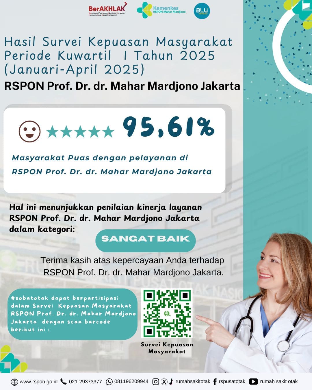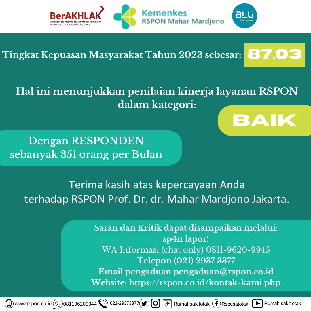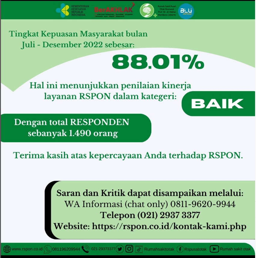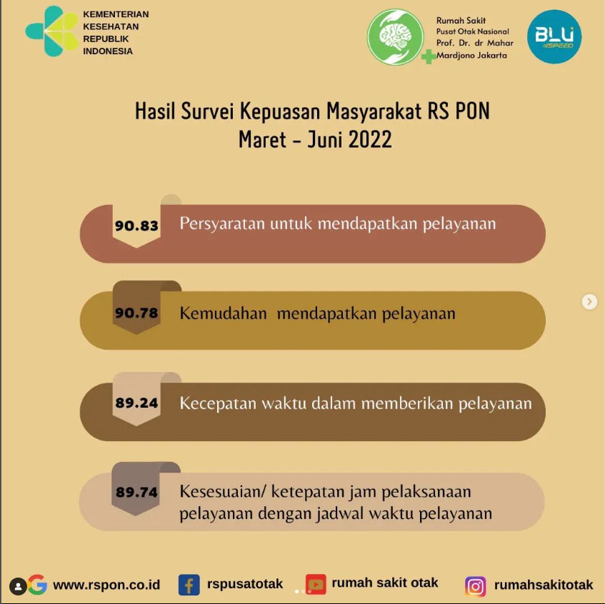 Survei Kepuasan Pelanggan yang dilakukan di Rumah Sakit Otak Nasional secara berkala menunjukkan hasil yang positif. Mayoritas pasien menyatakan puas dengan pelayanan yang diberikan, terutama pada aspek pelayanan dokter dan perawat. Keramahan serta profesionalisme tenaga medis menjadi faktor utama yang diapresiasi oleh pasien. Selain itu, fasilitas yang memadai dan proses pendaftaran yang efisien juga turut berkontribusi pada kepuasan pasien.